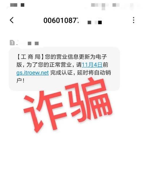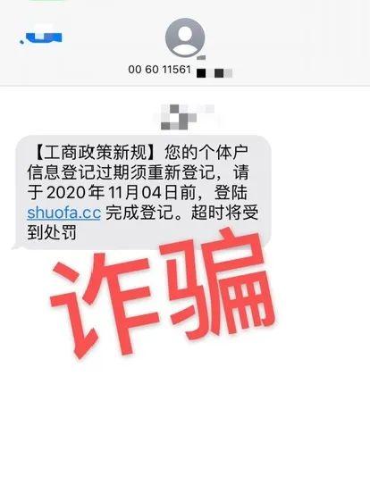 2、11月4日,我市市民黄某报警称,收到一条号码为“006010949***”的短信,内容是“【工商局】您的营业信息更新为电子版,为了您正常营业,请前往gs.nb***fa.net完成认证,延时将自动销户”,黄某信以为真,点击短信上的网址进入按要求输入姓名、身份证及银行卡等信息,并将收到的验证码也输了进去,后被扣款2万元,发现被骗。