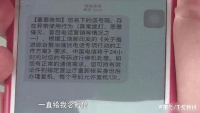 最近就发生一件关于手机引发的事情,王女士的手机被莫名其妙的停机了。王女士是街道上的工作人员,她每天的工作就是扶持计划生育这些的事情,所有她打电话的时间也是非常多的,要经常和居民进行联系。但在前几天在手机中无意中看到一条奇怪的短信,这条信息的大致内容就是说王女士的这个手机号已经存在异常行为,将会在一天之内对此手机号做出停机的处理。王女士的手机卡是中国电信的卡,在之前王女士已经使用这个手机号码十年多了,所以王女士对于这个信息也就没多大理会,以为是垃圾短信就没有在在意过!